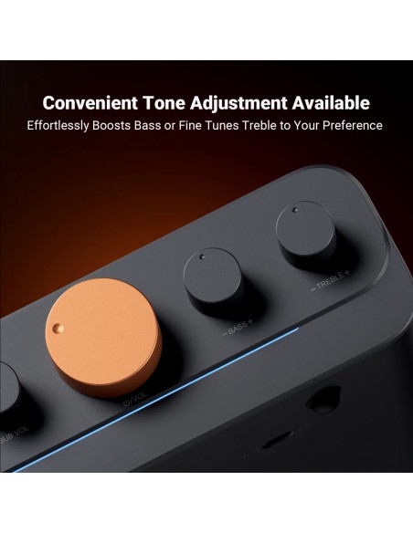 Operación sin esfuerzo: con un diseño integral fácil de usar con una fuente de alimentación incorporada, acompañada de control remoto, ajuste de tonos graves y agudos, una perilla central multifuncional para control de volumen, encendido/apagado y cambio de modo, luz ambiental indicadora de modo LED, etc. Disfrutar de la música nunca ha sido tan fácil.