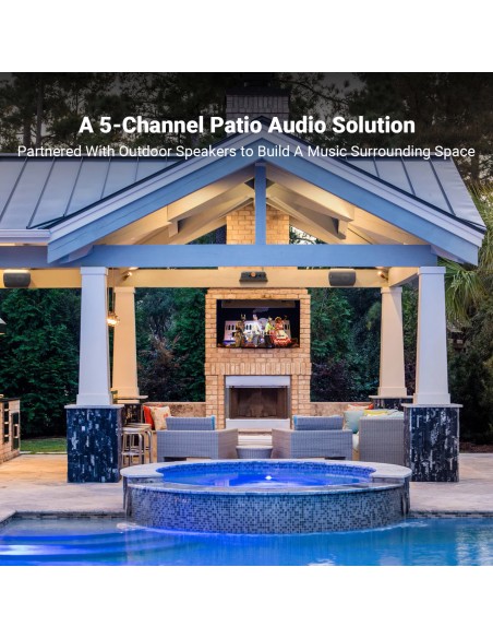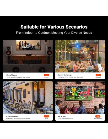 Solución para múltiples escenarios: ideal para combinar con parlantes exteriores o montados en la pared, perfecto para configurar sistemas de audio de 2 a 5 canales en entornos como patios, cafés, restaurantes, bares, etc. También puede servir como cine en casa o amplificador de sistema HiFi de escritorio, satisfaciendo sus diversas necesidades desde entornos interiores hasta exteriores.