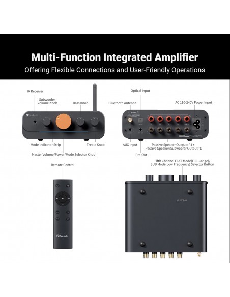 Amplificador todo en uno: Un miniamplificador que integra DAC y amplificación de potencia. Este amplificador estéreo admite hasta 5 canales de salida, conmutables entre 4.1 y 5.0 canales. Cuenta con Bluetooth, entradas AUX y digitales ópticas, además de preamplificador y compatibilidad con hasta 5 salidas de altavoz.