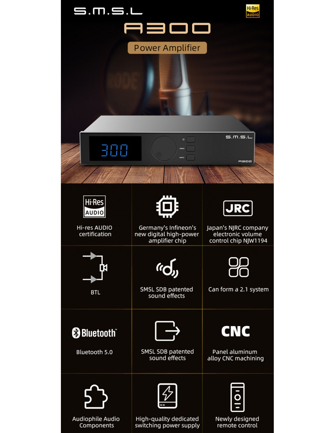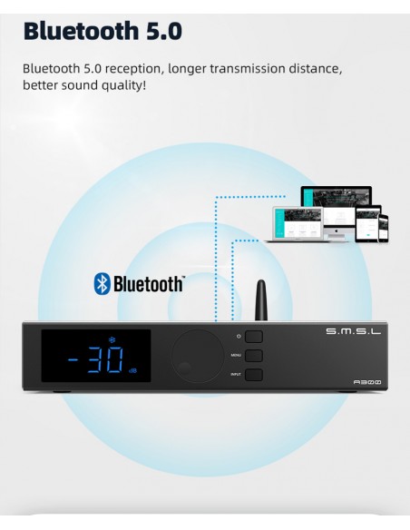 SMSL A300 Amplificador de alta fidelidad 2.1 con Hi-Res Bluetooth 5.0, con control remoto.