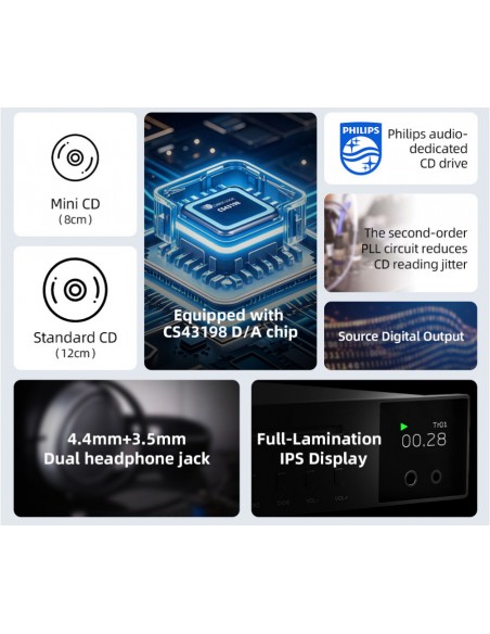 Proceso de mecanizado CNC de aluminio, utilizando tecnología de anodizado, mano de obra fina y tacto de primera clase; se utiliza una gran cantidad de componentes de audio de grado audiófilo para mejorar el sentido subjetivo de la audición; terminales de entrada y salida chapados en oro de alta calidad; sobrecalentamiento perfecto, sobrecorriente y otros circuitos de protección;
