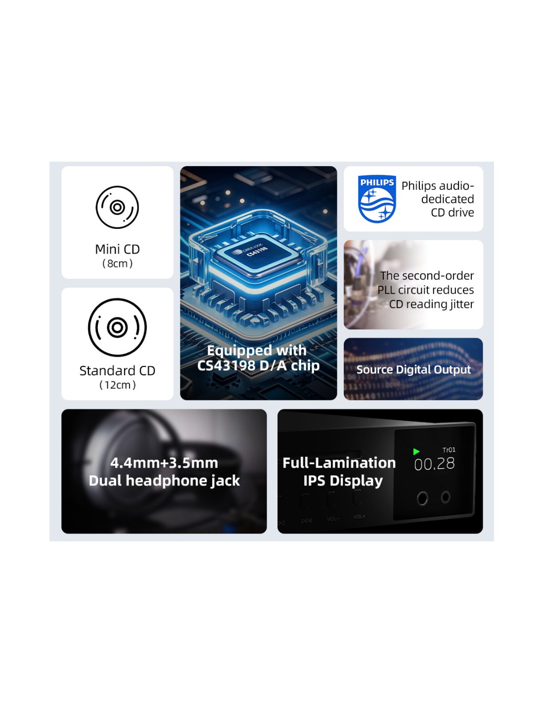 Reproduce sin problemas tu preciada colección de CD en un solo dispositivo. Su compatibilidad verdaderamente universal mejora tu experiencia, ampliando las posibilidades de escucha con una versatilidad sin esfuerzo.