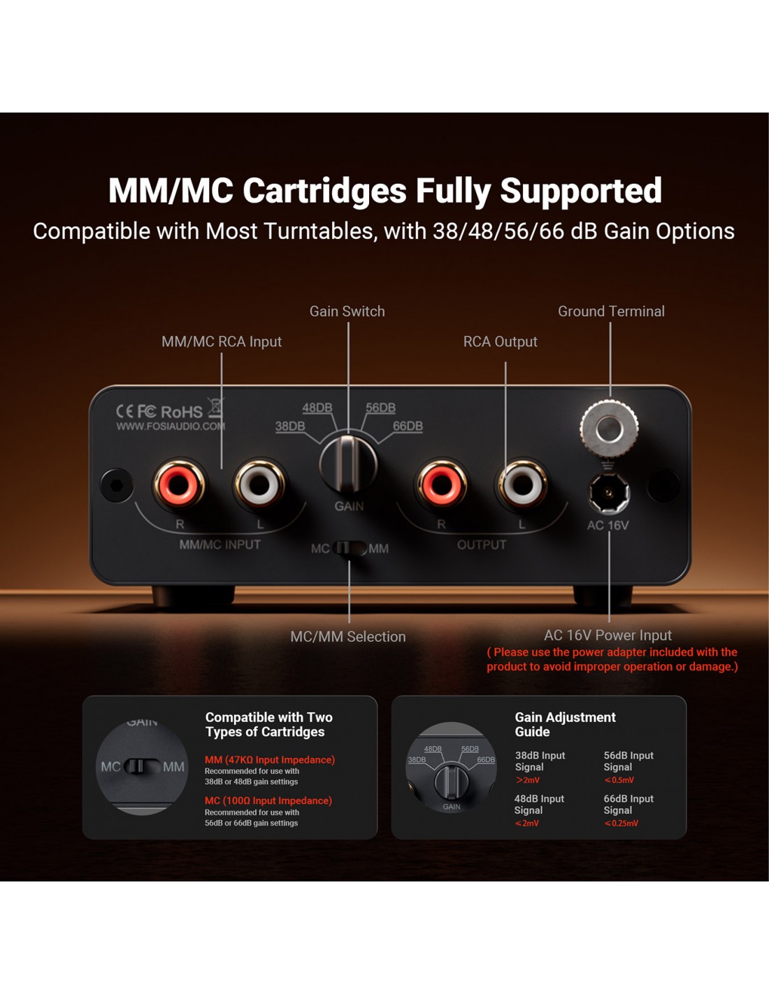 Diseño intuitivo: Cuenta con un botón de encendido de un solo toque, control de ganancia y un práctico interruptor para alternar entre cartuchos MC y MM. Además, el puerto de conexión a tierra garantiza una conexión segura.
