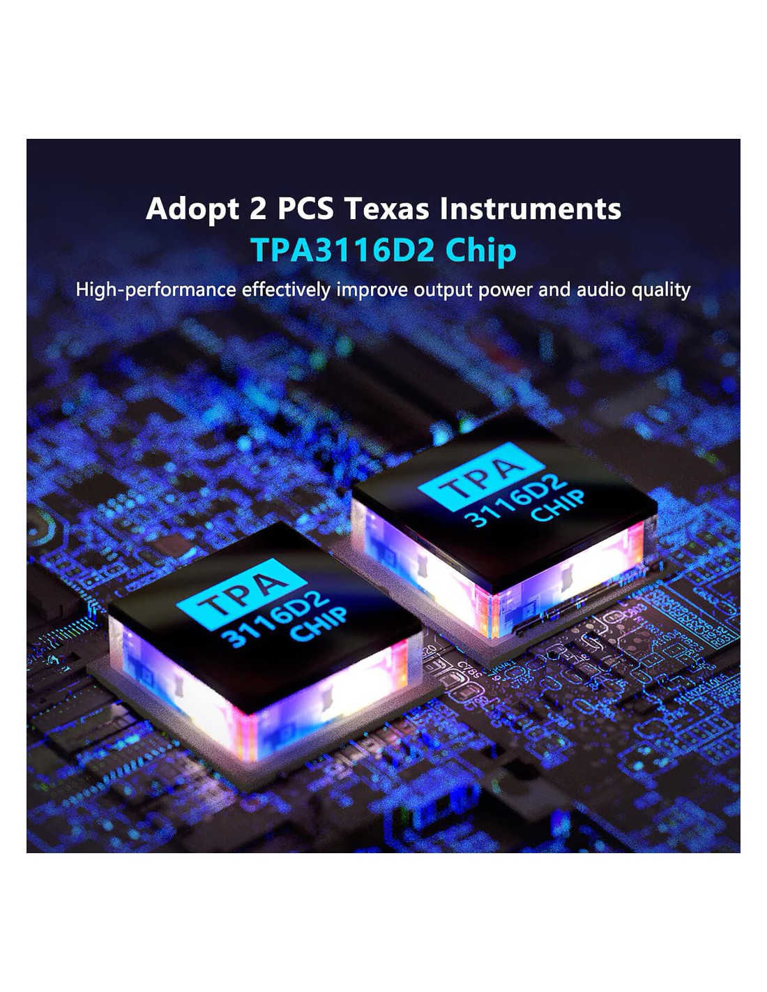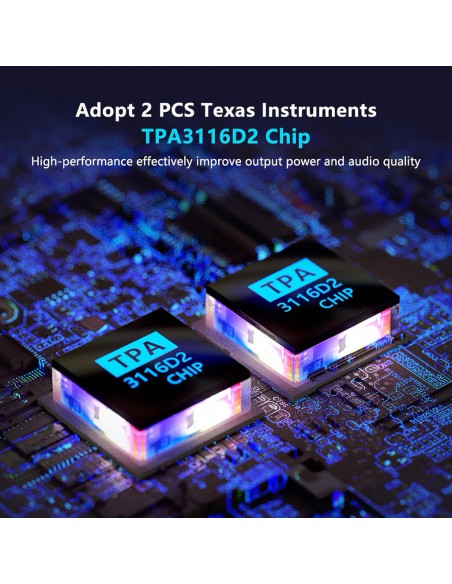 El amplificador estéreo Bluetooth adopta un chip de amplificador TPA3116D2 de instrumento texas de rendimiento de 2 piezas, potencia de salida máxima de doble canal 50 W x 2 + 100 W para obtener un sonido de audio claro, sin pop, sin ruido audible, totalmente silencioso cuando no se reproduce nada a través de él;