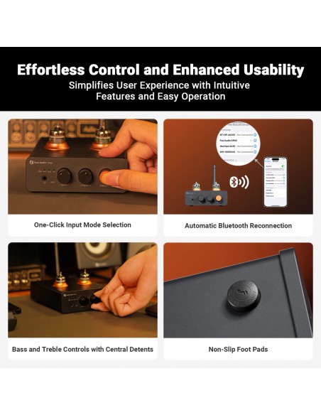 Compacto pero creativo: con su forma compacta y una combinación de controles de volumen, graves y agudos del preamplificador, el preamplificador estéreo produce un sonido más dulce y orgánico al tiempo que preserva las frecuencias medias y agudas que hacen la música.