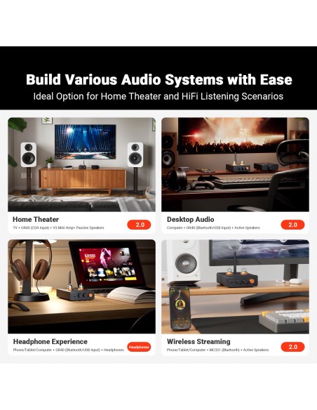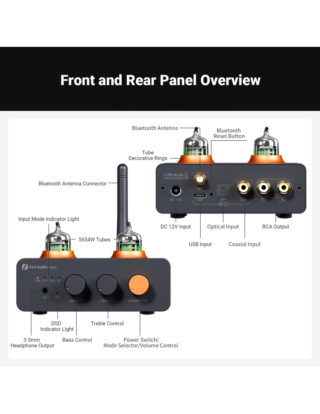Preamplificador DAC multifuncional: el GR40 es un preamplificador DAC de tubo versátil y amplificador de auriculares en uno, admite entradas Bluetooth/USB/ópticas/coaxiales y salida de auriculares de 3,5 mm/altavoces activos, con un modo de prioridad para auriculares.