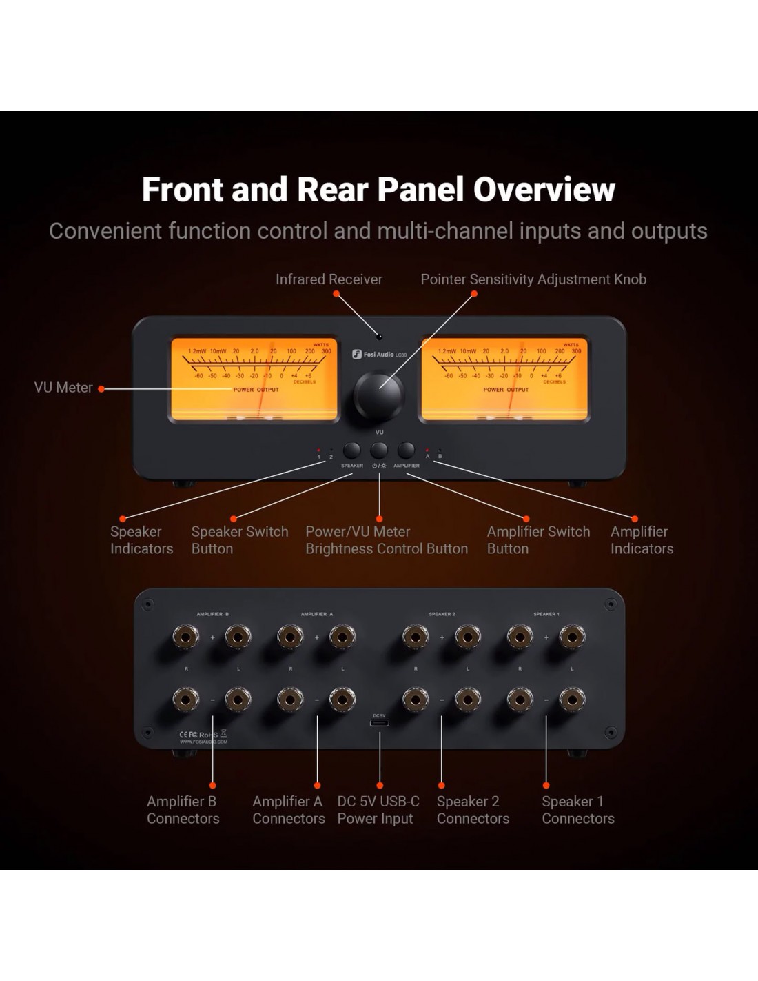 Fosi Audio LC30 Conmutador de altavoces Medidor VU analógico dual 2 entradas 2 salidas
