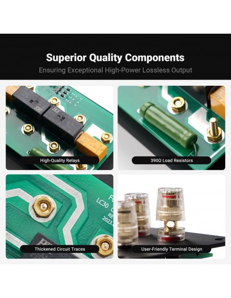 Componentes superiores: integrado con resistencias de carga protectoras de 390 Ω, circuitos de lámina de cobre engrosada, postes de conexión de parlantes de primera calidad y relés de conmutación, el LC30 garantiza que prácticamente no haya impacto ni pérdida en la calidad del sonido y admite una transmisión de potencia máxima de 250 W por canal. Esto le permite disfrutar del sonido de alta fidelidad más puro.
