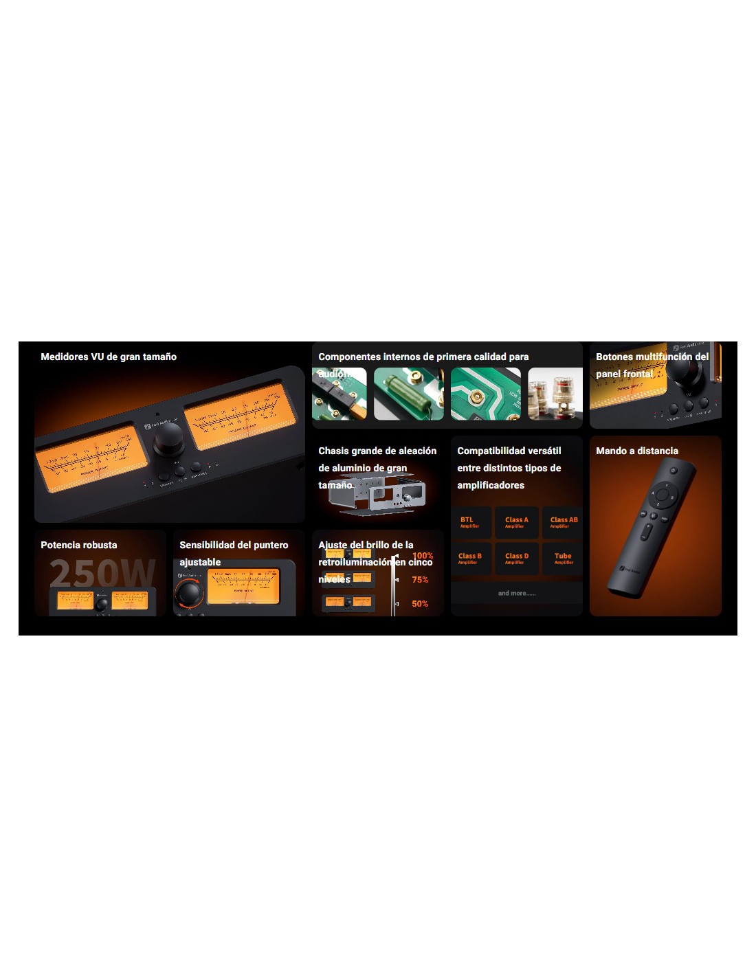 - Ajuste del brillo del medidor VU 5 niveles (100%, 75%, 50%, 25%, Desactivado)