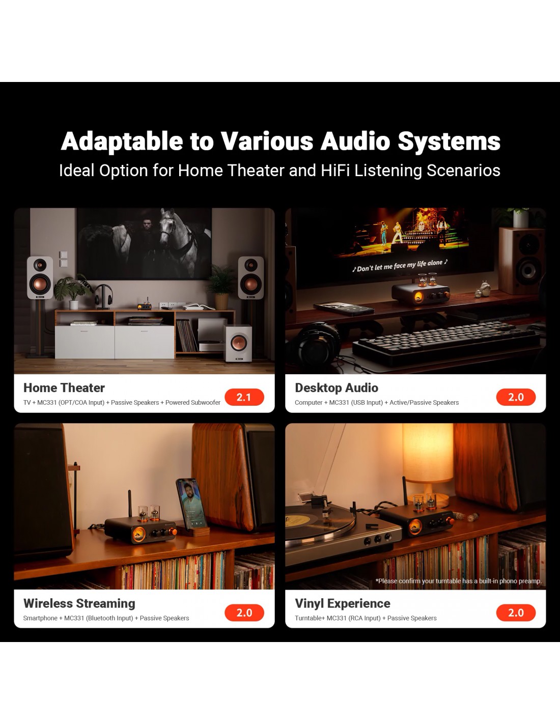 Flexibilidad de configuración: Admite entradas Bluetooth, USB, coaxial, óptica y RCA, lo que lo hace compatible con una variedad de fuentes, como computadoras, teléfonos, reproductores de CD, tocadiscos con preamplificadores de phono incorporados, etc., lo que le permite construir varios sistemas.