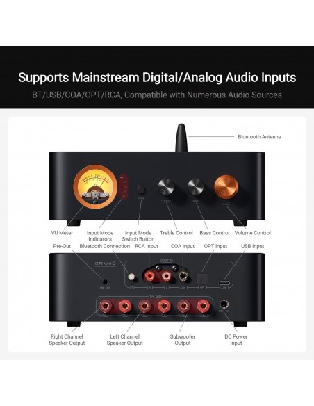 Diseño de control fácil de usar : admite la conmutación con un solo toque entre 5 modos de entrada e incluye controles de graves y agudos, con topes centrales para atenuar el tono, para una fácil personalización del sonido. También cuenta con una función de espera automática, que ingresa al modo de espera después de 2 minutos sin entrada de señal para reducir eficazmente el consumo de energía.