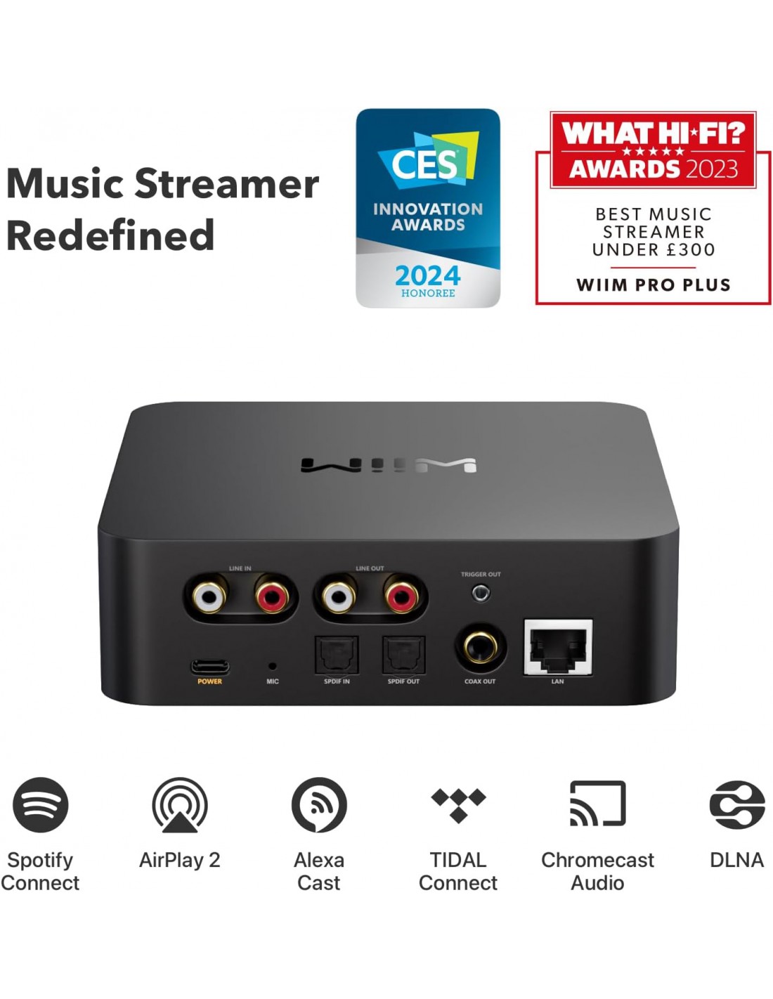WiiM Pro Plus es un streamer de música de grado audiófilo con AirPlay 2, Chromecast, DLNA, Spotify Connect, TIDAL Connect, Alexa Cast y audio multihabitación. WiiM Pro Plus convierte tu sistema estéreo existente en inteligente, para que puedas reproducir toda tu música favorita desde tu aplicación de servicio de música, la aplicación WiiM o tu voz usando Alexa, Google Voice o Siri, todo con la mayor fidelidad de sonido posible.