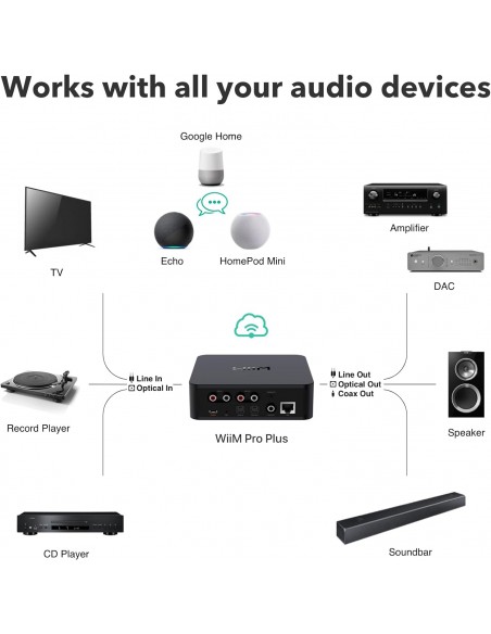 Transmisión multisala sin problemas: con WiiM Pro Plus, disfruta de la comodidad de transmitir música en toda la casa utilizando una variedad de altavoces inteligentes, incluyendo AirPlay 2, Chromecast, Amazon Alexa o una función patentada multihabitación. Crea grupos con otros dispositivos AirPlay 2, Google Home o Alexa como Echo, HomePod, o incluso vincula varios dispositivos WiiM para la reproducción sincronizada en múltiples dispositivos de audio simultáneamente. También puede transmitir audio SPDIF-in o Line-In a dispositivos habilitados para AirPlay.
