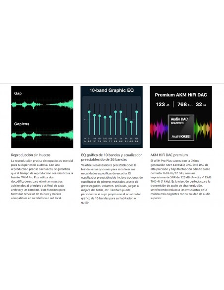 El WiiM Pro Plus cuenta con la última generación AKM 4493SEQ DAC. Este DAC de alta precisión y baja fluctuación admite audio de hasta 768 kHz/32 bits, con una impresionante SNR de 123 dB (A-wt) y -115dB THD+N (1 kHz). Es la elección perfecta para la transmisión de audio de alta resolución, satisfaciendo incluso a los entusiastas de la música más exigentes con su calidad de audio superior.