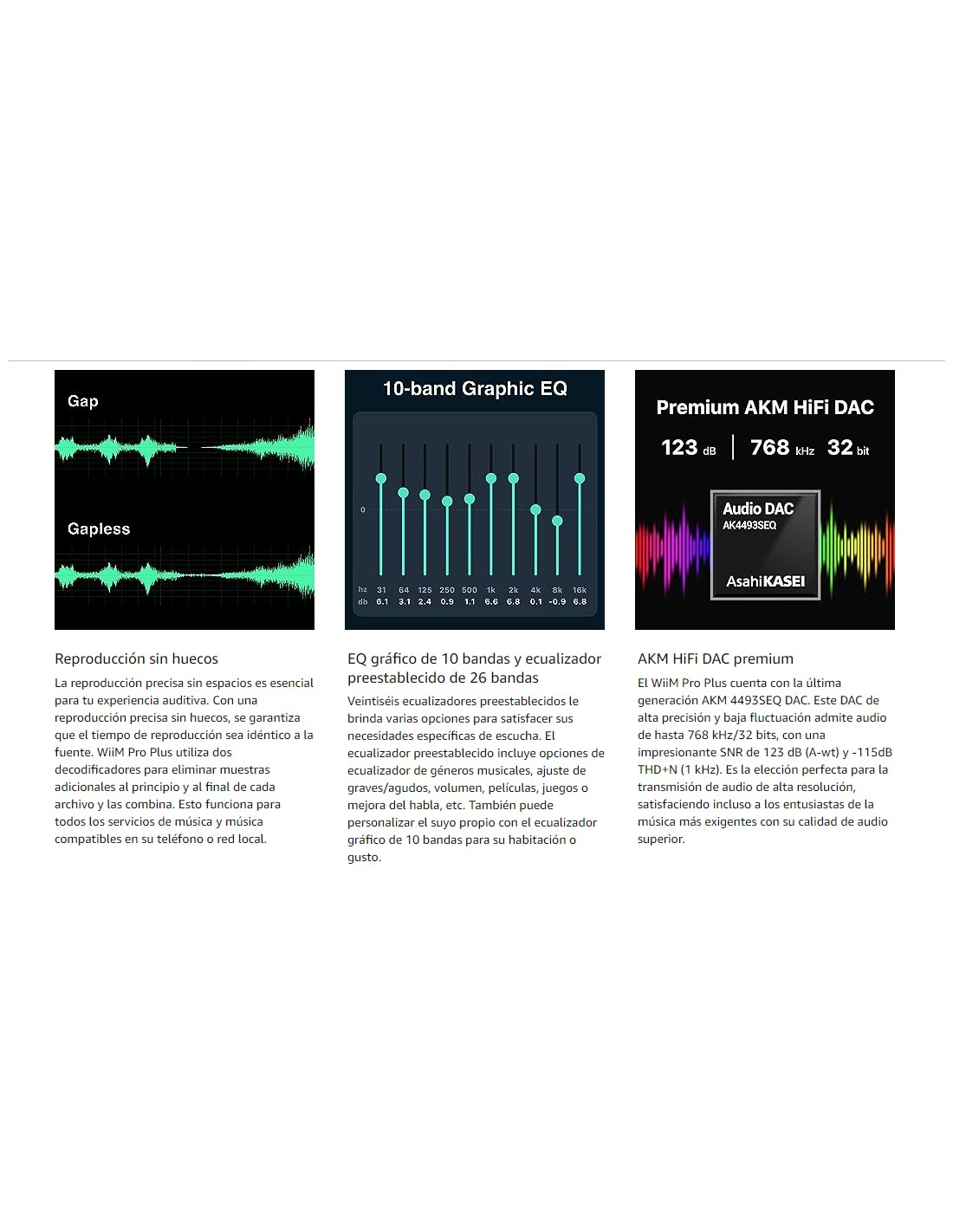 La reproducción precisa sin espacios es esencial para tu experiencia auditiva. Con una reproducción precisa sin huecos, se garantiza que el tiempo de reproducción sea idéntico a la fuente. WiiM Pro Plus utiliza dos decodificadores para eliminar muestras adicionales al principio y al final de cada archivo y las combina. Esto funciona para todos los servicios de música y música compatibles en su teléfono o red local.
