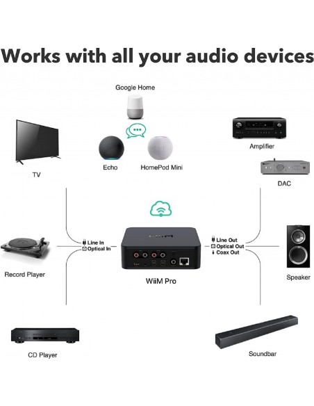 WiiM Pro convierte su sistema estéreo existente en inteligente, para que pueda reproducir toda su música favorita desde la aplicación de su servicio de música, la aplicación WiiM, o su voz usando Alexa, Google Voice o Siri, todo con la mayor fidelidad de sonido posible. NOTA: Es un dispositivo SOLO RECEPTOR, no puede TRANSMITIR AirPlay 2.