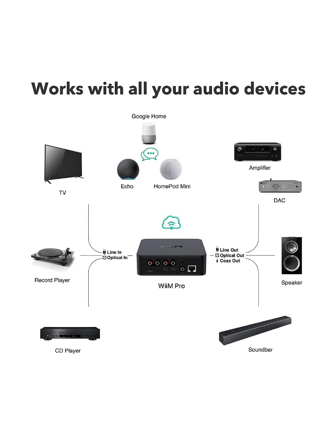 WiiM Pro convierte tu equipo estéreo en un receptor compatible con AirPlay 2. Transmite tu música favorita desde tus dispositivos iOS y Mac o transmite audio de TV desde Apple TV. Utiliza Siri en tu teléfono o HomePod para controlar la selección de música, el volumen y la reproducción. WiiM Pro es una forma fácil y asequible de conectar tus dispositivos Apple a tu equipo de audio favorito en casa. NOTA: Es un dispositivo SOLO RECEPTOR, no puede TRANSMITIR AirPlay 2.