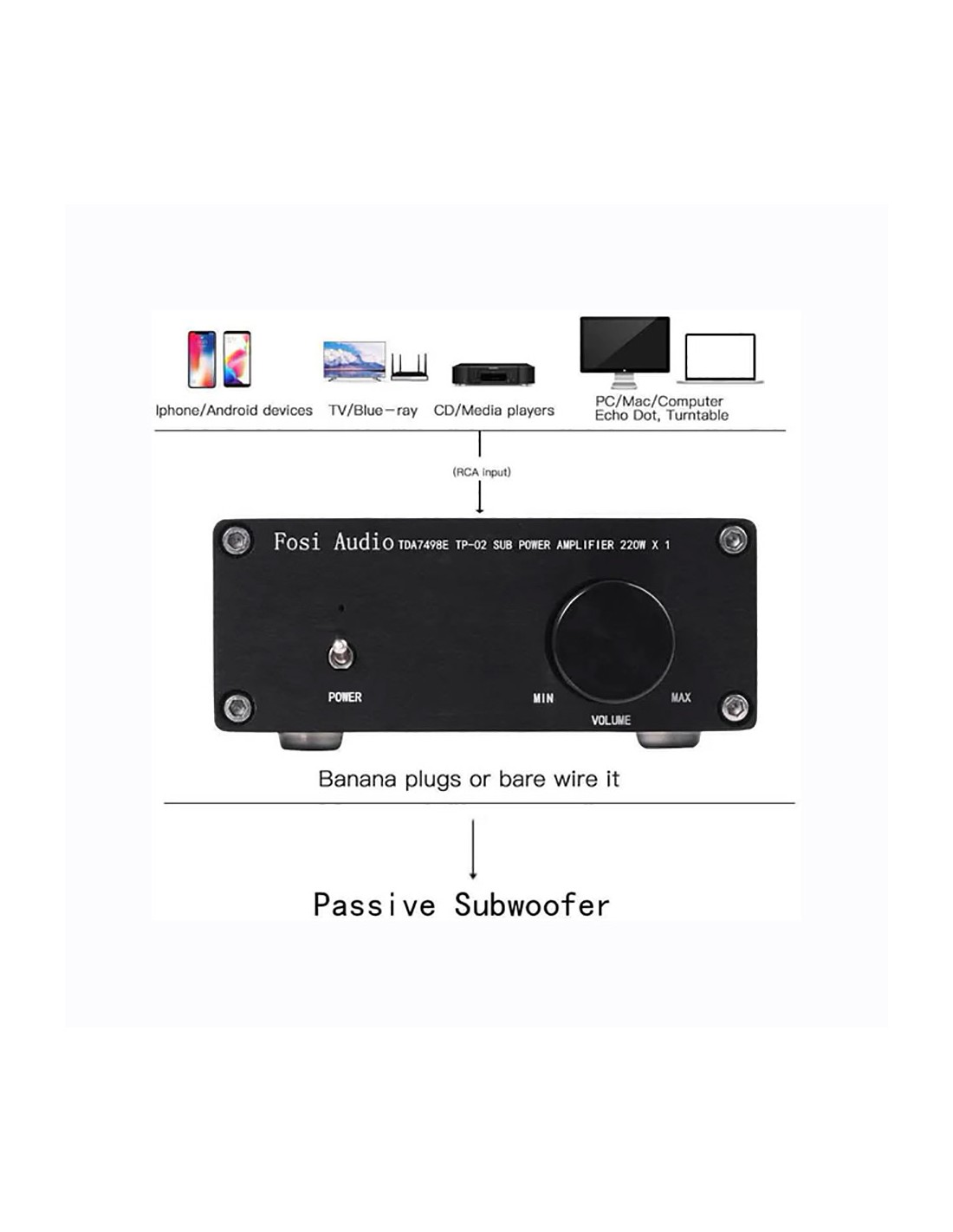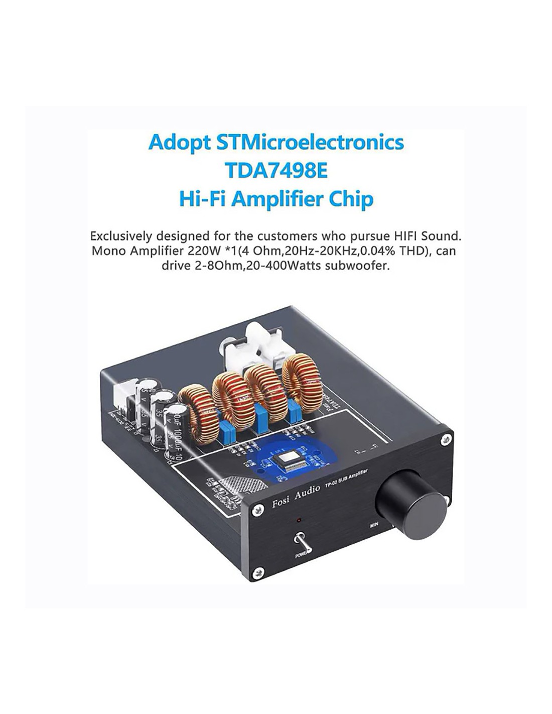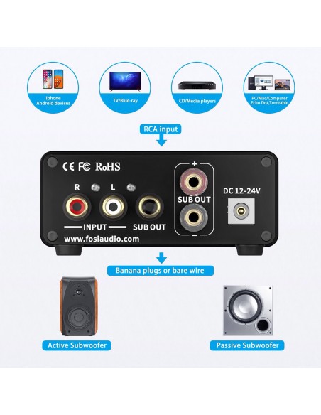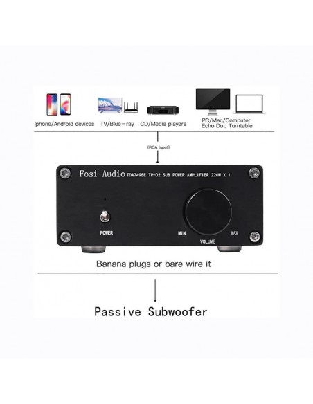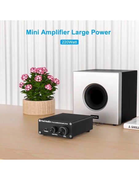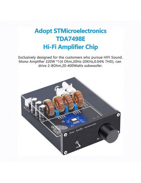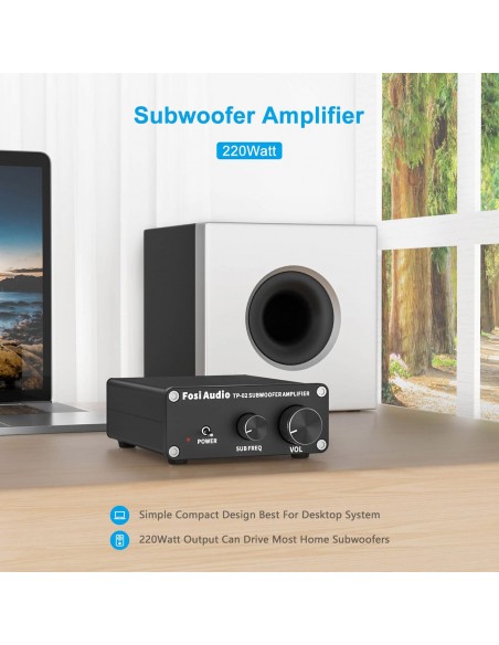 Filtro de paso bajo incorporado, 220 W X 1 (4 ohmios, 20 Hz - 120 Hz, 0,04 % THD, 18 db/octava) para subwoofer, diseño pequeño, simple y compacto pero práctico y potente;