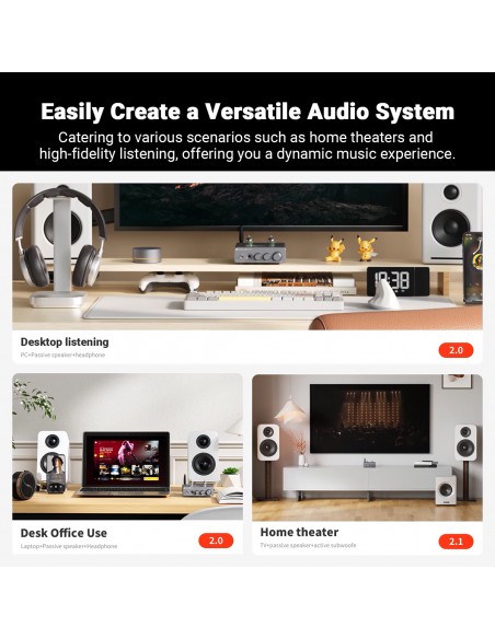Con unas dimensiones compactas de 122 × 137 × 41 mm y un peso de tan solo 1060 g, es ideal para uso doméstico, ordenadores de sobremesa y otros entornos. Su reducido tamaño y potente rendimiento lo hacen ideal tanto para sistemas de cine en casa como para configuraciones de audio de sobremesa, ofreciendo un audio de alta calidad.