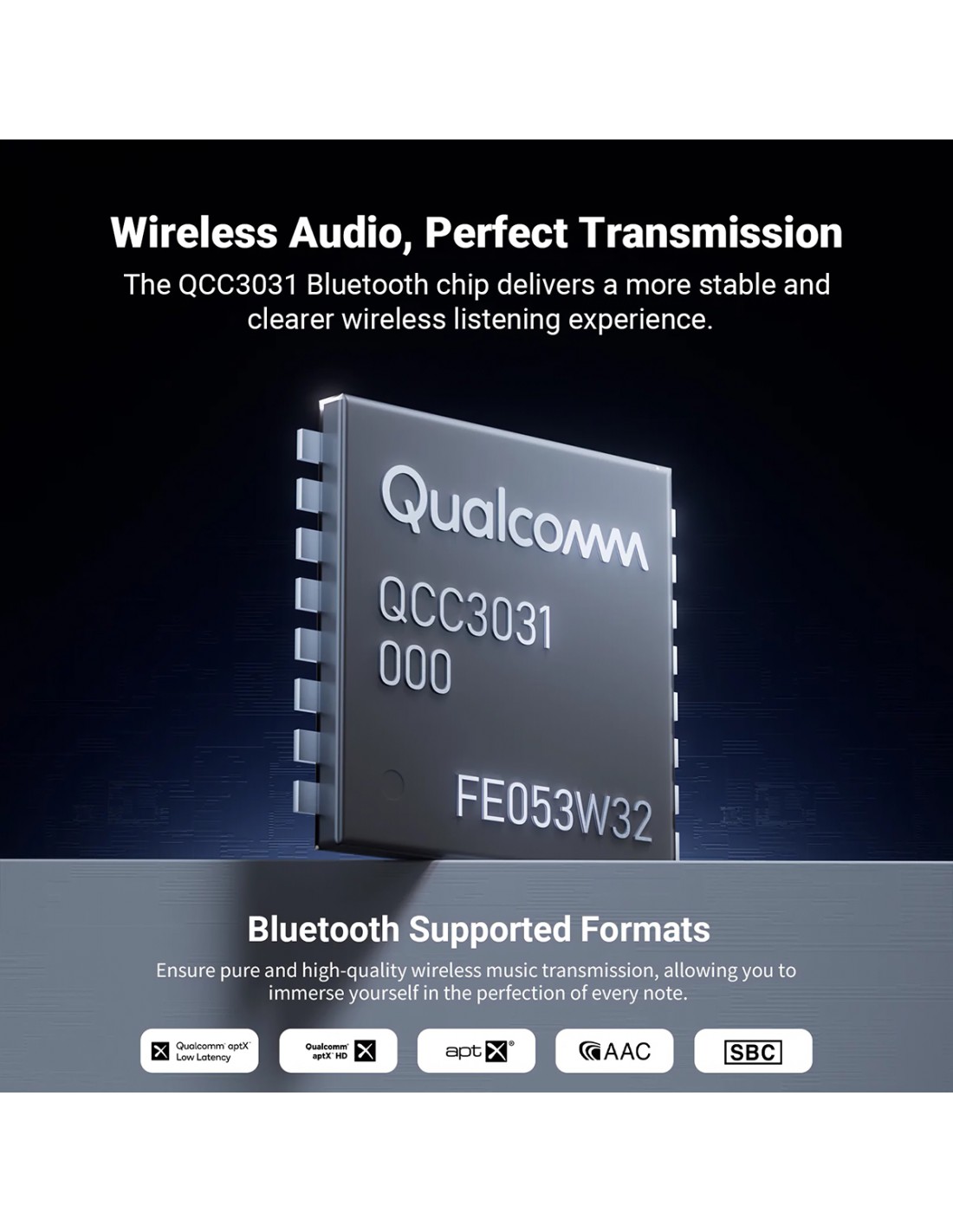 Compatible con transmisión Bluetooth 5.1 sin pérdidas, con una latencia ultrabaja (<50 ms) y una claridad excepcional, garantiza la sincronización de audio y video para una experiencia de escucha inalámbrica fluida y natural. El chip Bluetooth QCC3031 ofrece una estabilidad de conexión superior, reduciendo la interferencia de señal y la pérdida de transmisión para garantizar la integridad y precisión de los datos de audio.