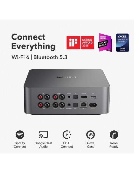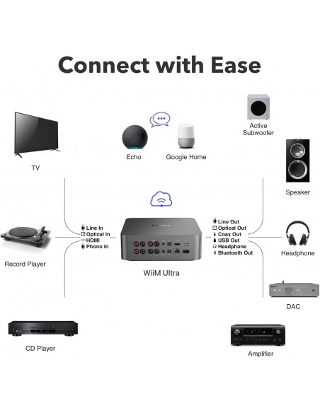 Opciones de conectividad versátiles: el WiiM Ultra ofrece una integración de audio versátil con su amplia gama de opciones de conexión. Cuenta con USB, óptico, coaxial, RCA, una salida de auriculares dedicada; HDMI ARC y entradas para RCA, Phono y Optical. Se integra perfectamente con fuentes digitales y analógicas, ofreciendo una flexibilidad sin igual para cualquier configuración de audio.