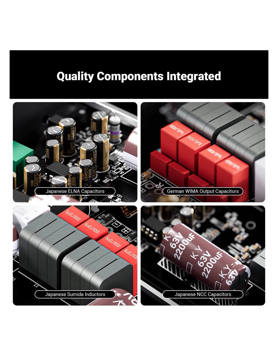 Calidad de sonido de alta gama : con el chip amplificador de potencia Clase D TPA3255 de Texas Instruments, el amplificador V3 logra una eficiencia energética excepcional. Con materiales de calidad audiófila, como inductores de audio profesionales Sumida, condensadores de filtro de alta capacidad NCC, condensadores de salida WIMA alemanes, condensadores ELNA japoneses, etc. Esos componentes de alta calidad permiten que V3 mantenga una estabilidad muy alta incluso en condiciones de trabajo de alta potencia. . Con el V3 , realmente puedes tener una experiencia de reproducción de música casi sin distorsiones.