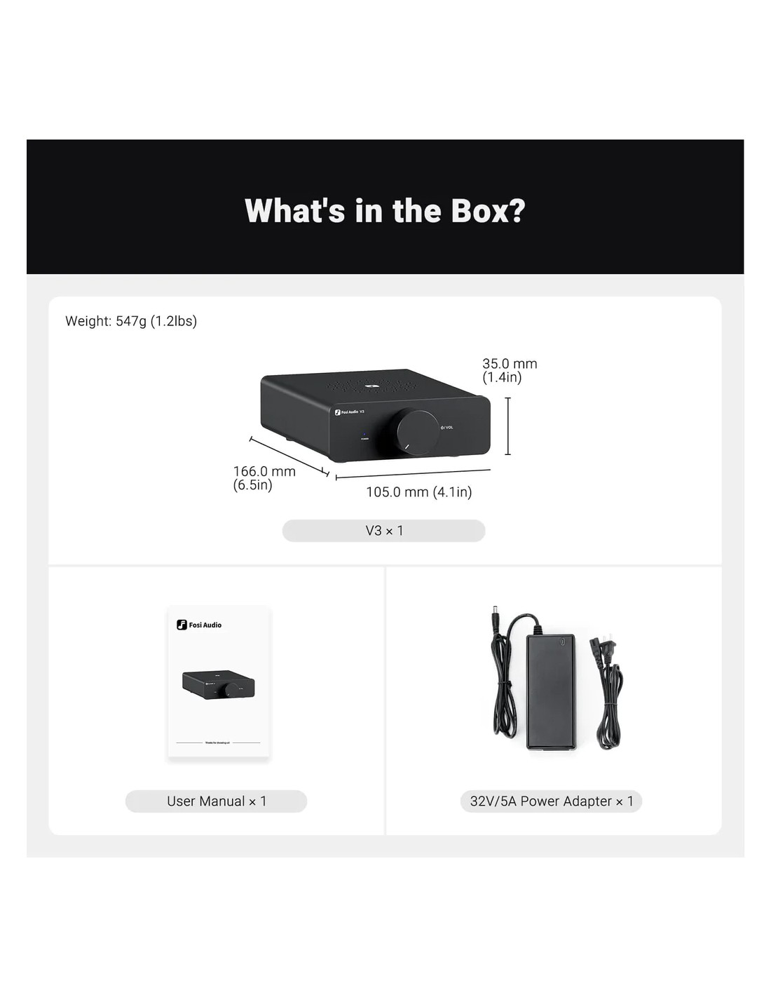 Salida de potencia de 300 vatios x 2 : Fosi Audio V3 es un mini amplificador de potencia HiFi clase D que ofrece una potencia de salida máxima de 600 W en dos canales, lo que garantiza una experiencia de audio potente y de alta fidelidad.