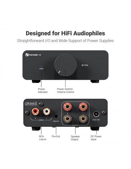 Compacto y versátil : A pesar de su tamaño compacto, el amplificador V3 tiene la capacidad de controlar altavoces pasivos de manera efectiva, lo que lo convierte en una opción versátil para amplificadores de tocadiscos, reproductores de CD y DVD para crear un sistema HiFi completo.