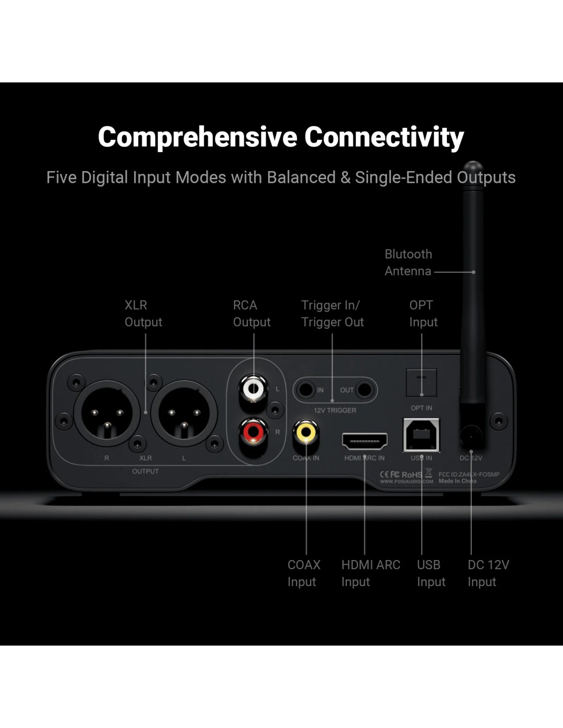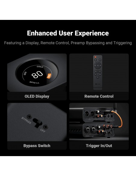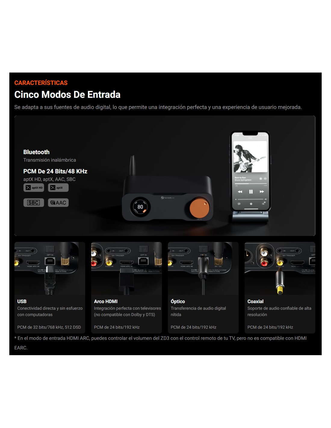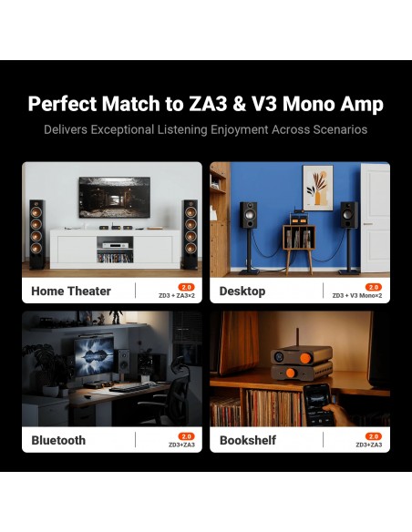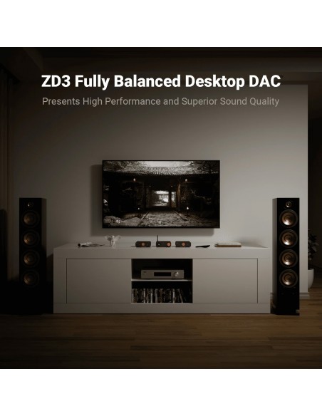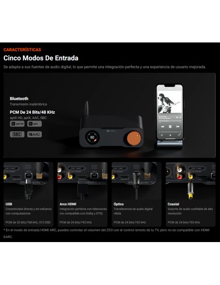 Versátil y flexible : el ZD3 ofrece una conectividad integral, compatible con entradas como Bluetooth, USB, OPT, COAX, HDMI ARC y salidas XLR/RCA balanceadas. Esta flexibilidad le permite personalizar su sistema de audio para que se adapte a diversas configuraciones y escenarios.