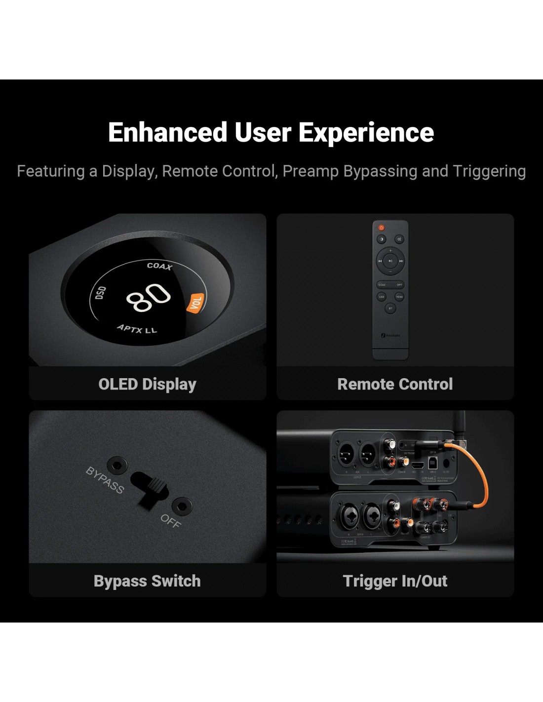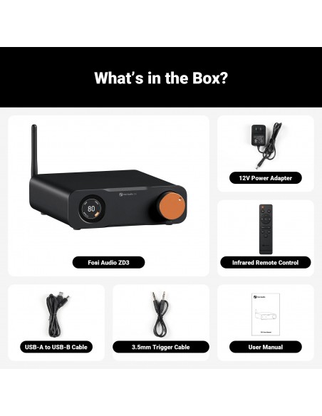 Facilidad de uso : El ZD3 adopta una pantalla OLED de 1,5 pulgadas, control remoto, interruptor de derivación de preamplificador e interfaces de entrada/salida de activación de 12 V, lo que permite el encendido/apagado sincronizado con otros dispositivos de audio domésticos, todo para una buena experiencia de usuario.