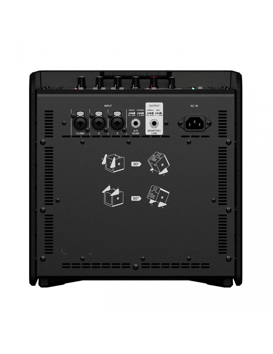 El soporte de goma en la base del gabinete le permite inclinar la unidad en un ángulo de inclinación de 30 o 60 grados para adaptarla a su aplicación o ambiente de desempeño elegido. Esto permite colocar el STAGEPAS 200 frente a la audiencia como orador de relleno, o hacia los artistas cuando se usa como monitor de piso.