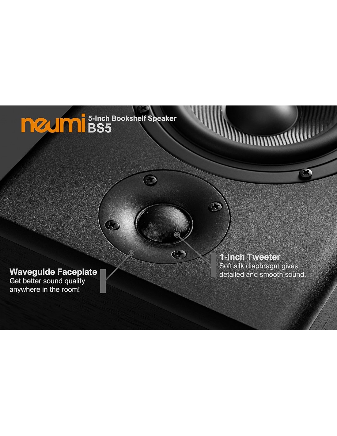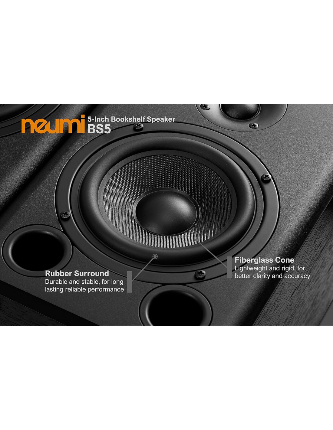 Fabricado con una combinación de cono de fibra de vidrio rígido y ligero y un borde de goma flexible, el woofer del BS5 está optimizado para ofrecer un excelente equilibrio entre graves y frecuencias medias, con una distorsión excepcionalmente baja a niveles de escucha normales.