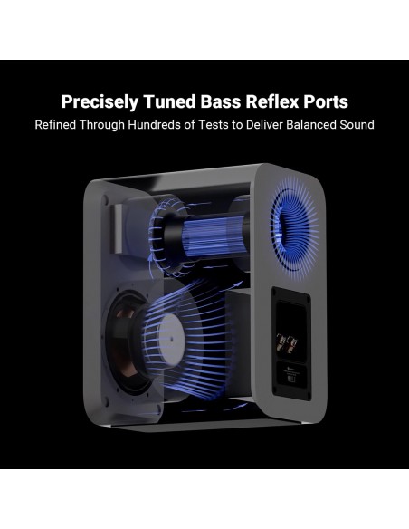 Diseño Reflex Optimizado: El puerto bass reflex ha sido ajustado por los ingenieros acústicos de Fosi Audio para reducir las ondas estacionarias y la turbidez. Mejora la extensión y el control de graves, garantizando un rendimiento limpio y preciso en la gama baja, incluso cerca de una pared.