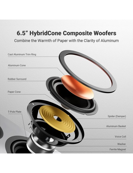 Graves Profundos y Texturizados: Los woofers HybridCone de 6.5", desarrollados internamente, combinan conos de papel con capas exteriores de aleación de aluminio, equilibrando la tonalidad natural y relajada del papel con la precisión y el control del metal, lo que resulta en graves más profundos y texturizados.