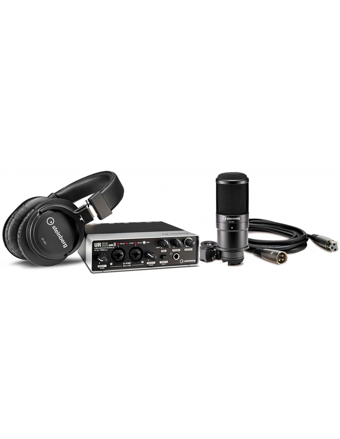 Graba y compón música en calidad de estudio en tu portátil, iPad o iPhone con la UR22mkII. Con una calidad de audio y fabricación fuera de serie para su categoría de precio, la UR22mkII combina componentes seleccionados con una conectividad avanzada y opciones de E/S flexibles para ofrecer una plataforma de producción completamente móvil.Gracias a su respuesta clara y equilibrada, el micrófono de condensador de estudio ST-M01 no tiene nada que envidiar a los micrófonos de estudio de alta calidad. Su alta sensibilidad y amplio rango de frecuencias son ideales para capturar incluso los matices más sutiles de cualquier fuente de audio. Tanto si se trata de voz, una guitarra acústica como de cualquier otro instrumento, el ST-M01 captura todos los aspectos de la señal en una calidad de audio excelente. También se incluye un cable de bajo ruido para conectar el micrófono a la UR22mkII. Los auriculares de estudio para monitorización ST-H01 convencen por su imagen de sonido precisa y verdadera. Son un aliado esencial para monitorizar durante la grabación y ofrecen una reproducción exacta durante el proceso de mezcla. El diseño cerrado evita que el sonido emitido por los auriculares sea capturado por el micrófono durante la grabación de voz. Por este motivo son perfectos para cantantes que deseen grabar su propia voz.