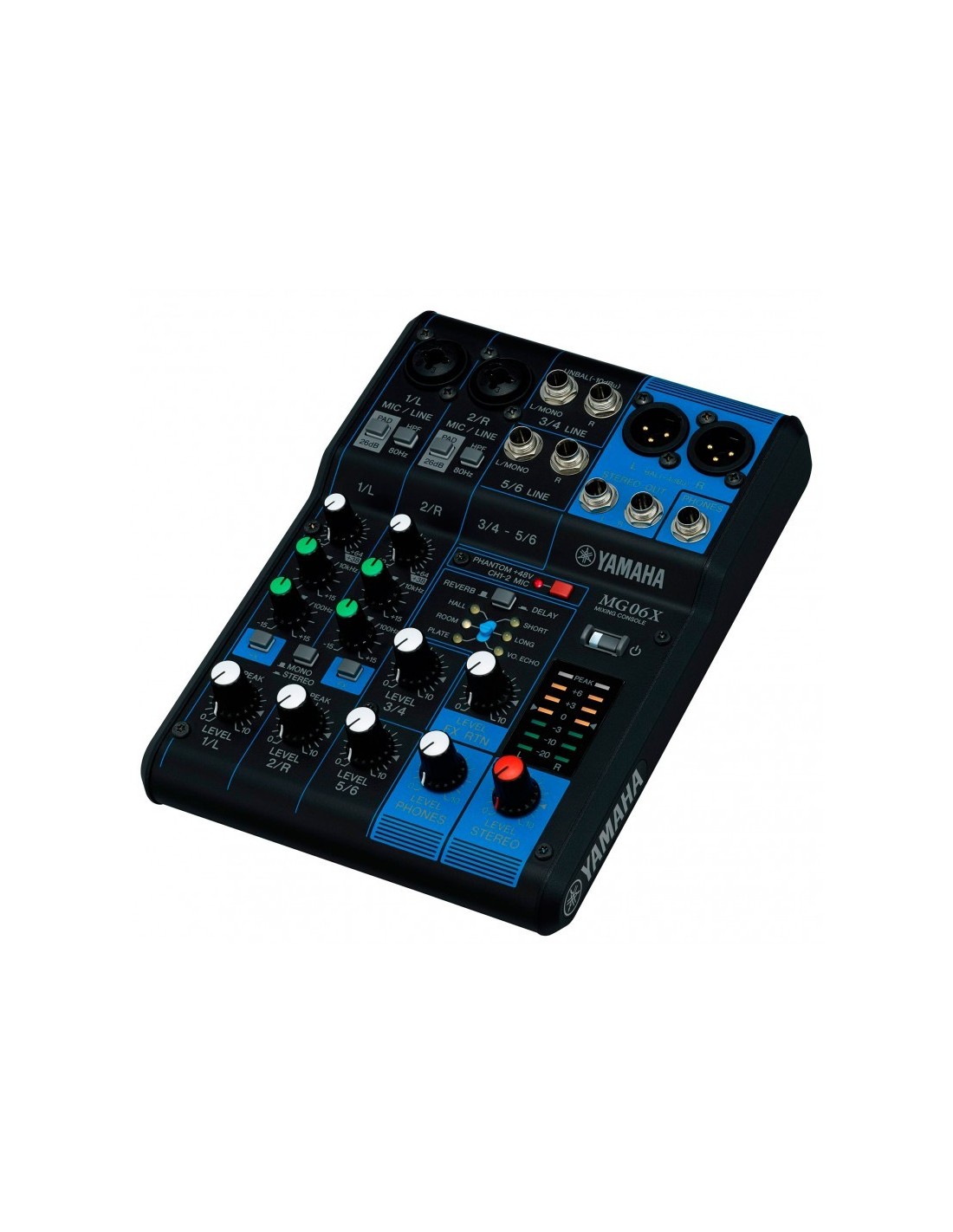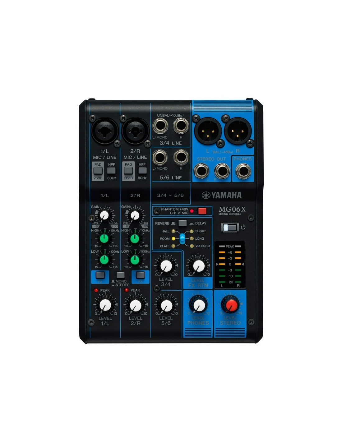 La Yamaha MG06X analógico mezclador cuenta con fantásticos componentes individuales para crear una consola capaz de ofrecer sonidos naturales y nítidos. El MG06X incluye alimentación phantom conmutable, preamplificadores de micrófono profesional y una gran variedad de conectores de entrada/salida. El modelo XU de la MG06 ofrece 6 efectos incorporados, incluyendo calidad profesional reverb y delay efectos. El mezclador de 6 canales está protegido con un chasis de metal robusto diseñado para los entornos de prueba de la carretera y la actuación en vivo.