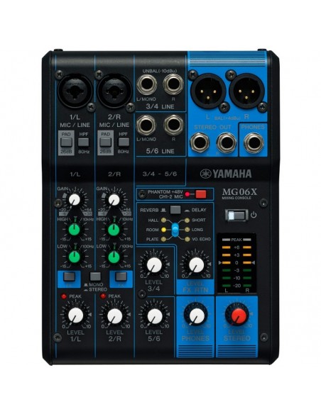 El MG06X incluye alimentación phantom conmutable, preamplificadores de micrófono profesional y una gran variedad de conectores de entrada/salida. El modelo XU de la MG06 ofrece 6 efectos incorporados, incluyendo calidad profesional reverb y delay efectos. El mezclador de 6 canales está protegido con un chasis de metal robusto diseñado para los entornos de prueba de la carretera y la actuación en vivo.