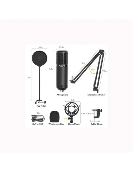 incluye micrófono * 1, brazo articulado * 1, soporte de choque metálico * 1, filtro antipop * 1, parabrisas * 1, cable XLR a XLR * 1 y manual de usuario * 1. Si tiene alguna pregunta sobre nuestros productos, comuníquese con nosotros, ¡estamos comprometidos a brindarle el mejor servicio!